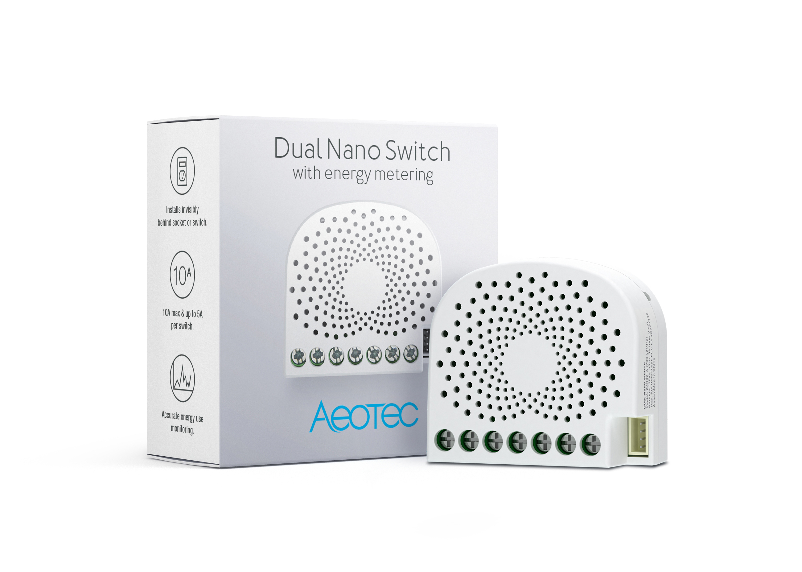 Convert any dual-switch or dual-outlet into a smart switch or outlet by connecting them to Z-Wave for wireless control and automation. Aeotec Dual Nano Switch allows you to automate, schedule and manually control 2 of your home’s neighbouring wall switches or power outlets using Z-Wave gateways, hubs and apps. Once connected to a Z-Wave system it offers on / off scheduling, manual control, and intelligent automation. Super small, only 1.58 inches wide and 0.76 inches deep, Dual Nano Switch is invisibly installed behind an existing switch or socket; using it allows you to make any switch or socket smart without having to replace it. This invisible method of installation works with a neutral wiring and allows for Dual Nano Switch to be controlled both by Z-Wave and the existing switch. Utilizing Z-Wave Plus and Aeotec’s Gen5 technology, Dual Nano Switch is compatible with certified Z-Wave gateways, hubs and software and can be controlled with Amazon Alexa when used with an Alexa compatible Z-Wave hub or gateway.