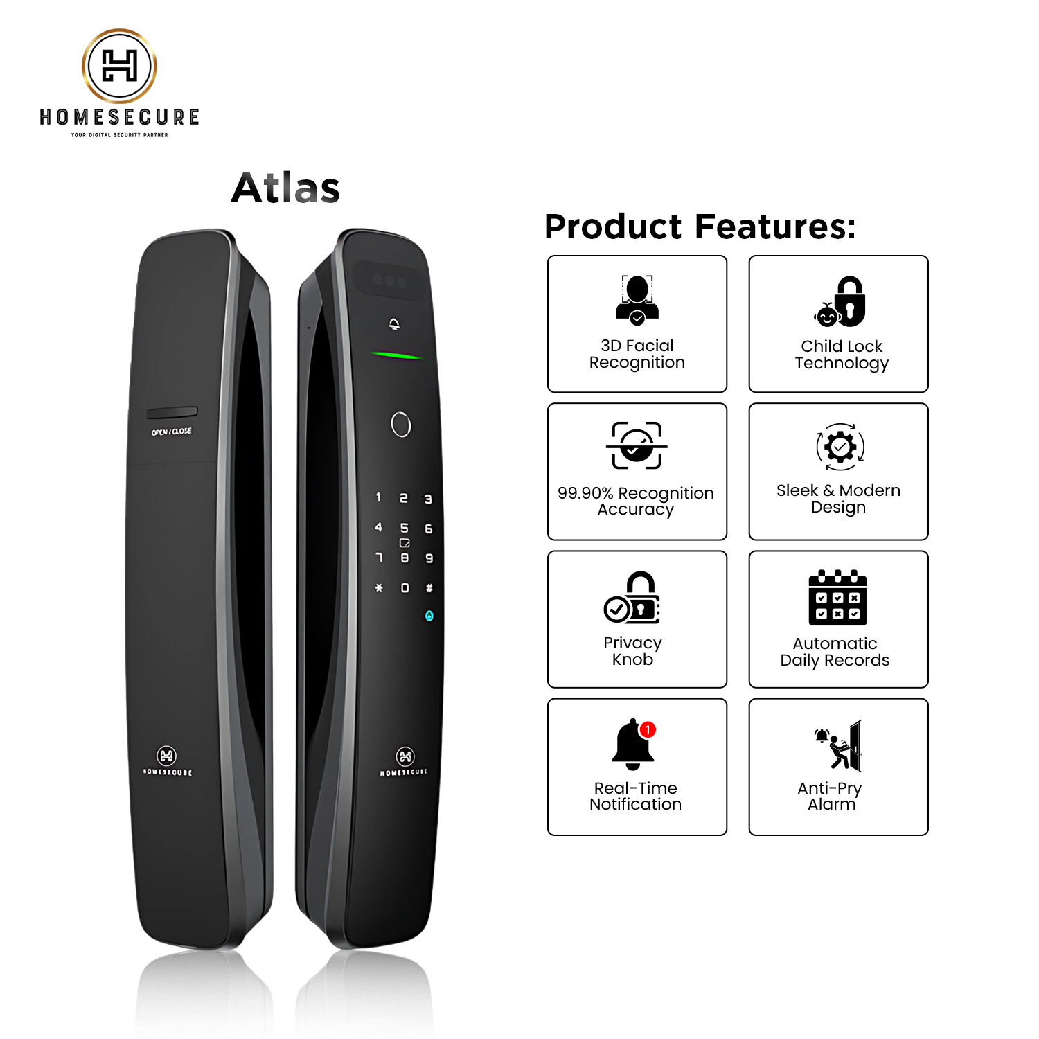 Modern digital lock with 6 different ways of unlocking, including 3D facial recognition and 0.5 second fingerprint recognition. With its Child Lock Function, Atlas ensures your little kids are protected and secured inside your home.