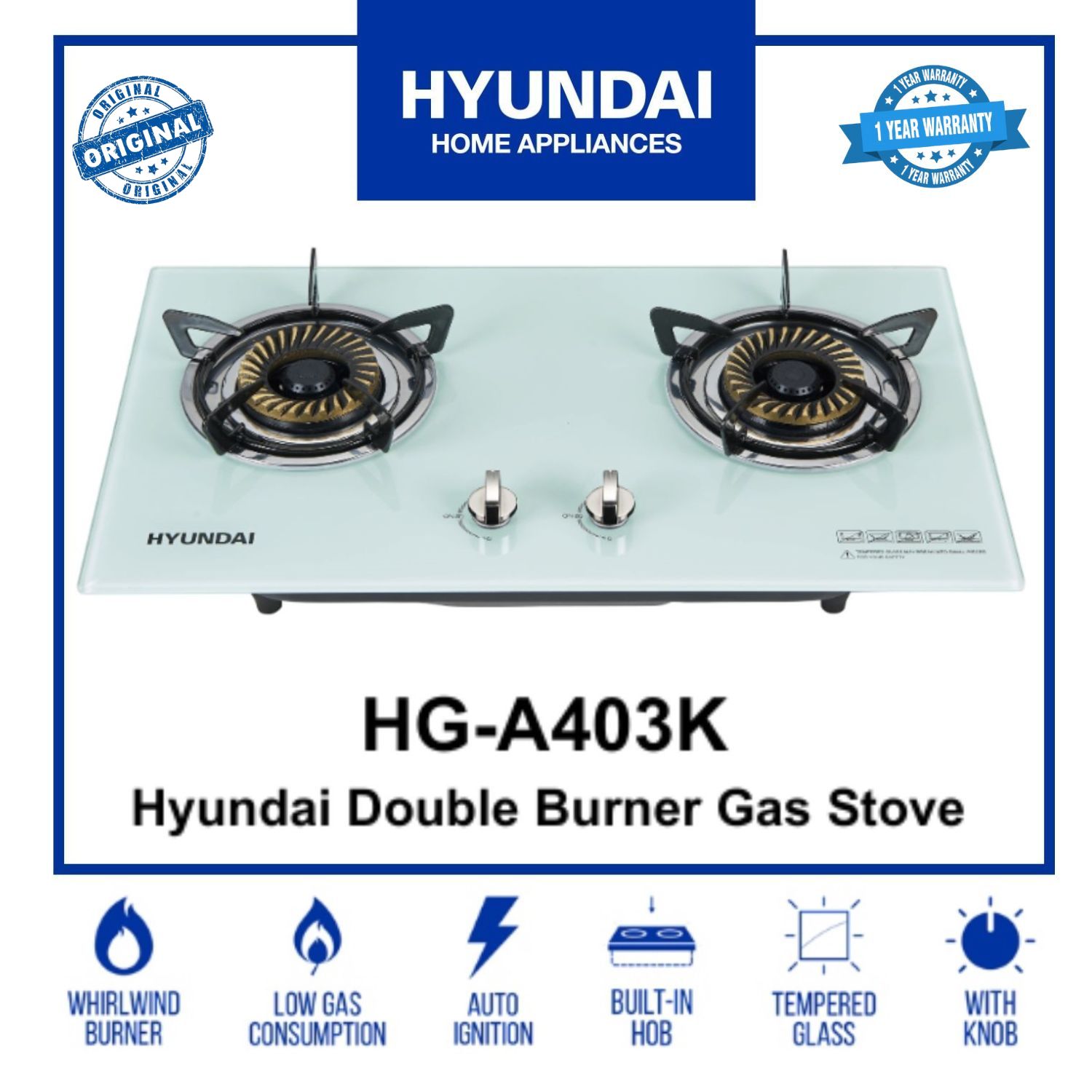 HYUNDAI BUILT-IN GAS STOVE 2 BURNER White Tempered glass elegant design
