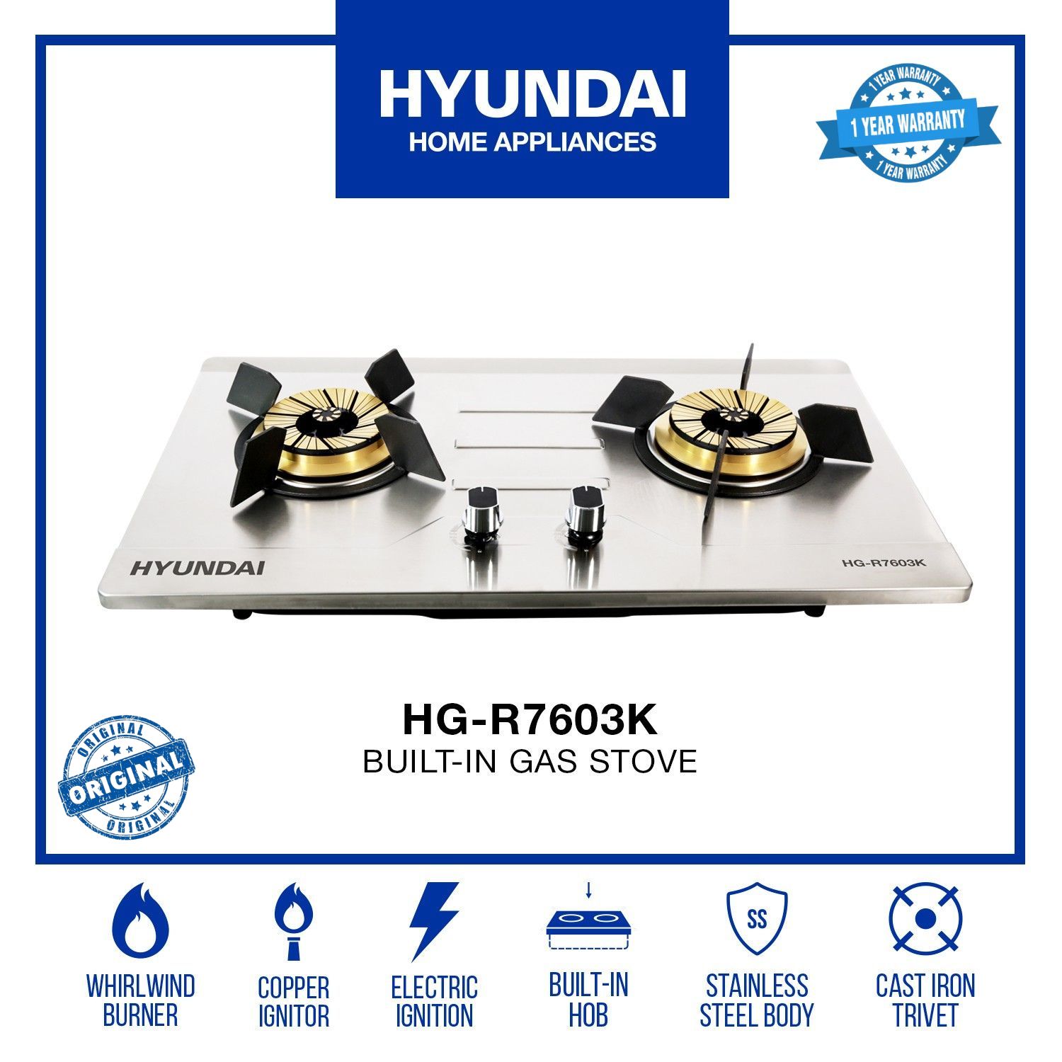 A built-in double burner gas stove with a stainless steel body, equipped with a whirlwind burner for a more efficient gas consumption. With a cast iron trivet that helps heat the food evenly, along with an electric ignition function.
