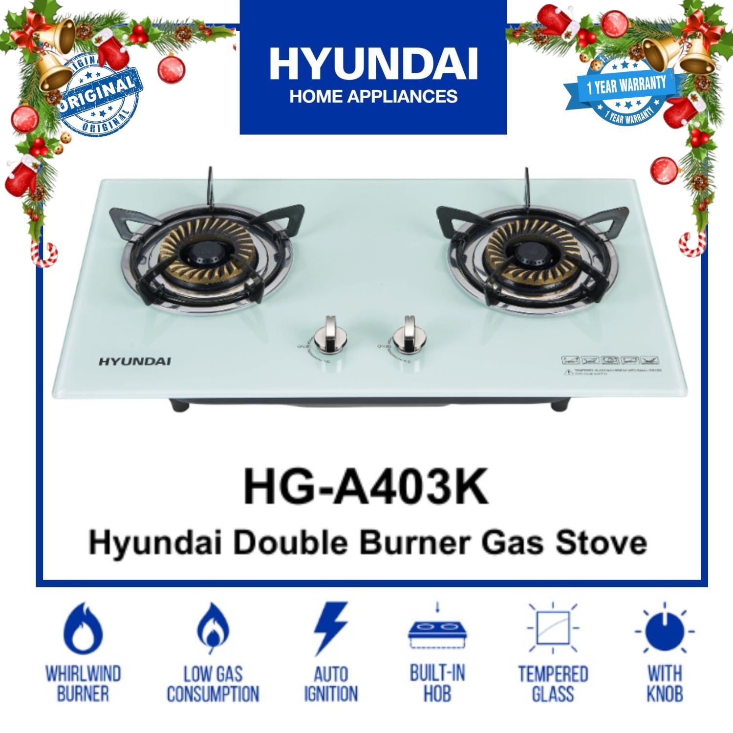 HYUNDAI BUILT-IN GAS STOVE 2 BURNER White Tempered glass elegant design