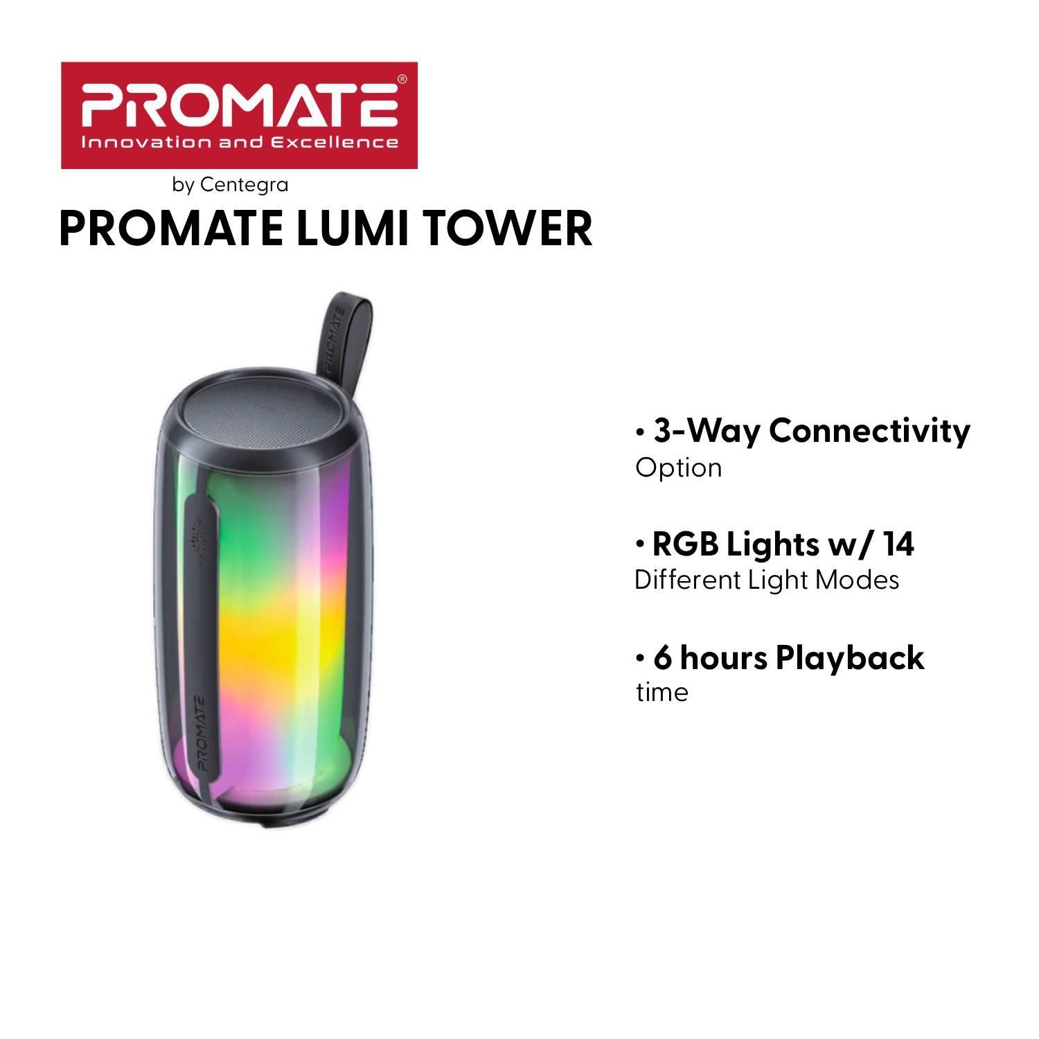 LumiSound HD True Wirless Bluetooth v5.3 HD Speaker•Tower Design•3-Way Connectivity Option•Easy Navigation•RGB Lights w/ 14 Different Light Modes•6 hours Playback time•AUX,USB drive & TF Card•IPX4 Water Resistance