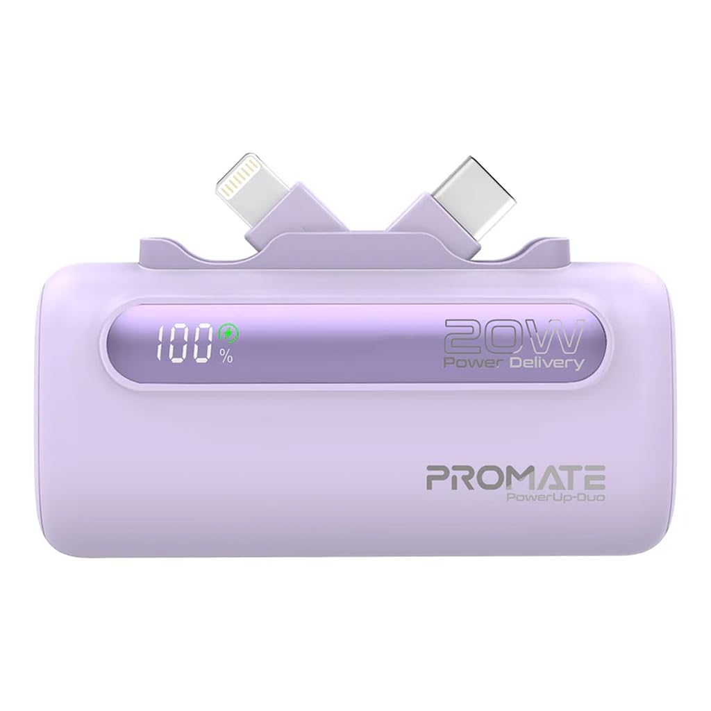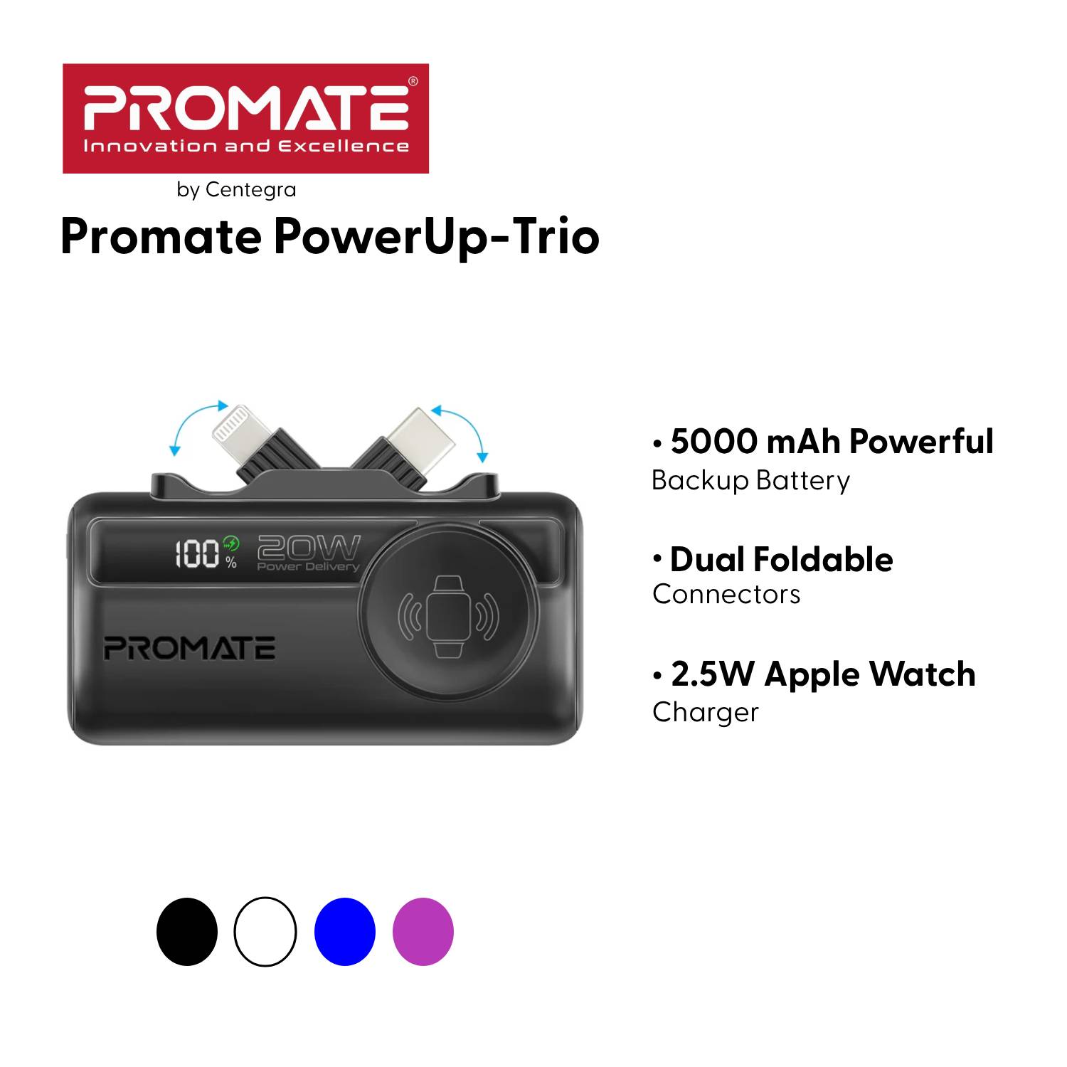 Promate raises the bar for compact portable power with the all-new PowerUp-Trio 5000mAh Mini Power Bank. Seamlessly integrating cutting-edge technology into a compact design, this pocket-sized powerhouse features a trio of charging options including a 20W USB-C™ In/Out foldable connector, 12W Lightning output foldable connector, plus a dedicated 2.5W Apple Watch charger on the front. Engineered for safety and reliability, it includes over-charging and over-heating protection. Its sleek metal kickstand doubles as a sturdy support for hands-free viewing. With a portable, mini form factor, versatile charging options and an intuitive LED display for battery monitoring, the Promate Mini Power Bank is your ultimate companion for staying charged, connected, and in control wherever you go.